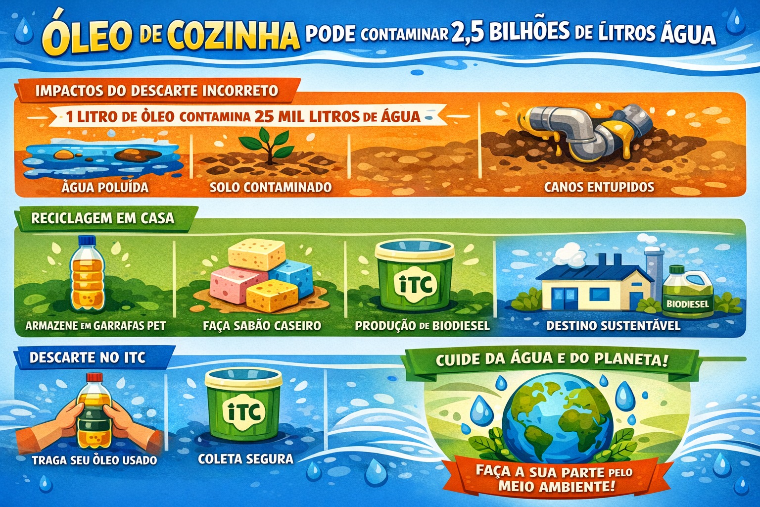 👉 Faça parte dessa mudança. Separe seu óleo usado e traga para o ITC. Juntos, cuidamos do presente e do futuro.